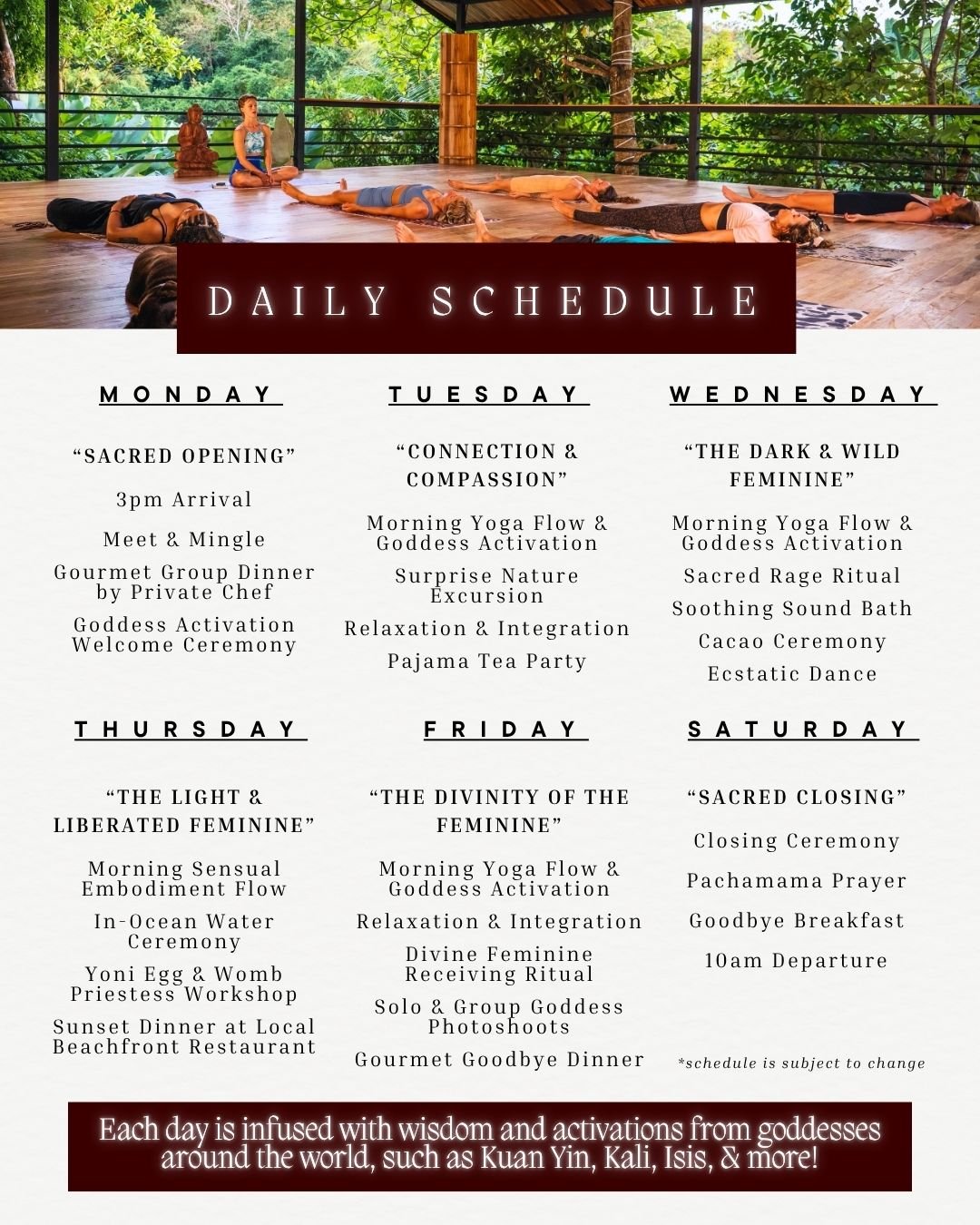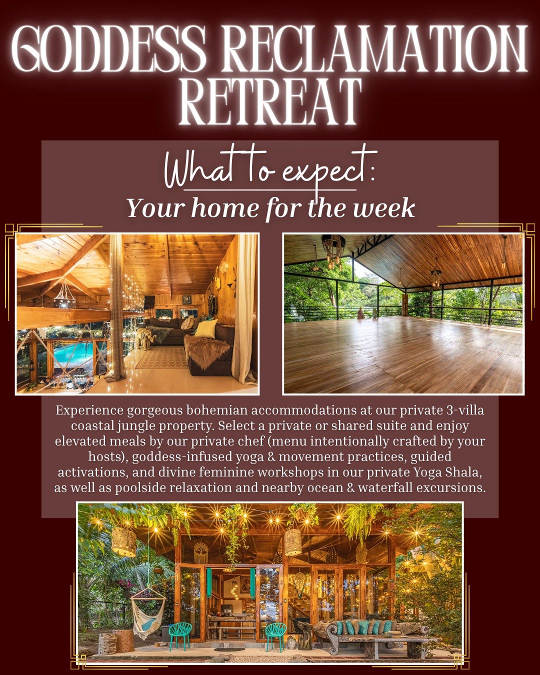For 6 days & 5 nights, you will journey with like-minded women in the beautiful coastal jungle of Jacó, Costa Rica. You’ll experience luxury bohemian accommodations in our private 3-villa property featuring 2 pools, Yoga Shala, nearby beach, and private chef! Expect morning yoga & embodied movement practices infused with goddess-based teachings & activations, guided meditative journeys, alchemical rituals, gourmet meals, and divine nature excursions (including an in-ocean water ceremony!).