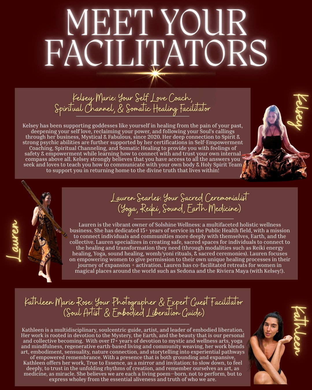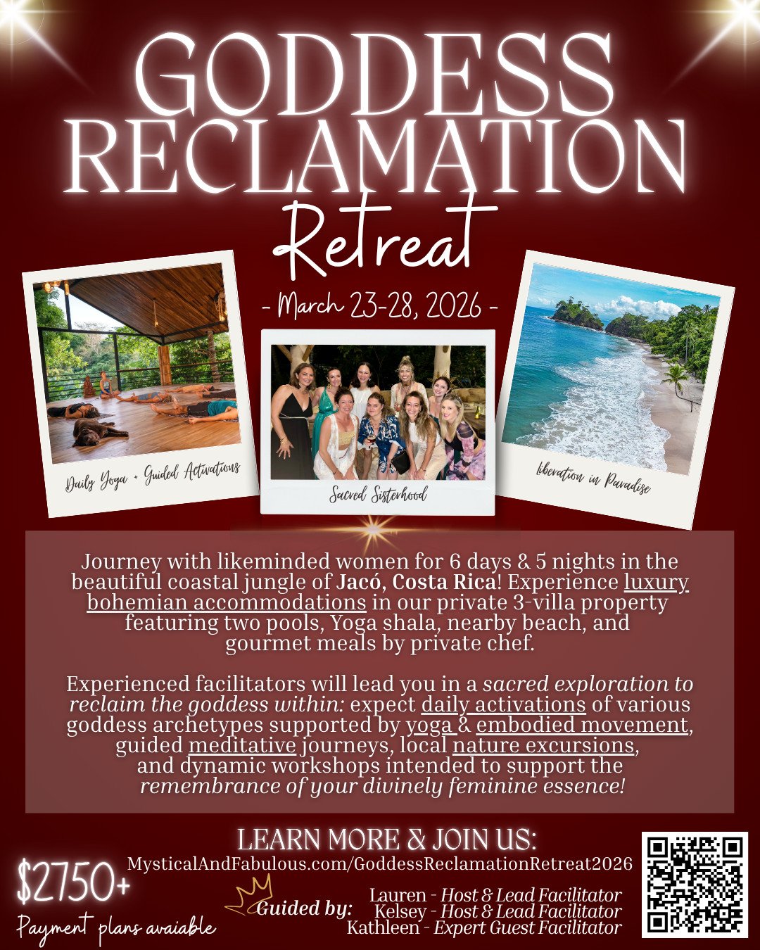 Hi! I'm Lauren, one of the co-creators of the Goddess Reclamation Retreat next March in beautiful Costa Rica. I'm also the founder of Solshine Wellness: an elevated on-site wellness company specializing in Yoga, Sound Healing, Reiki, and sacred ceremonies.