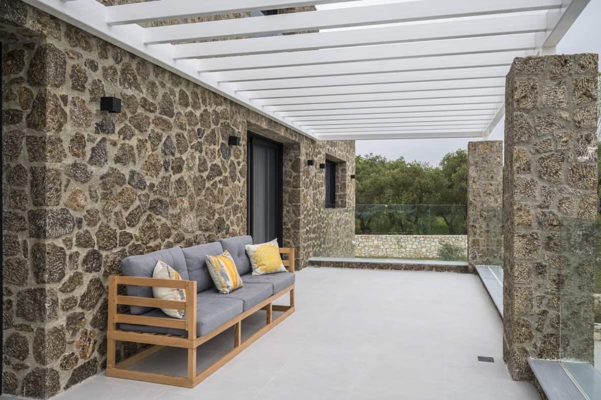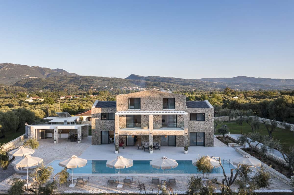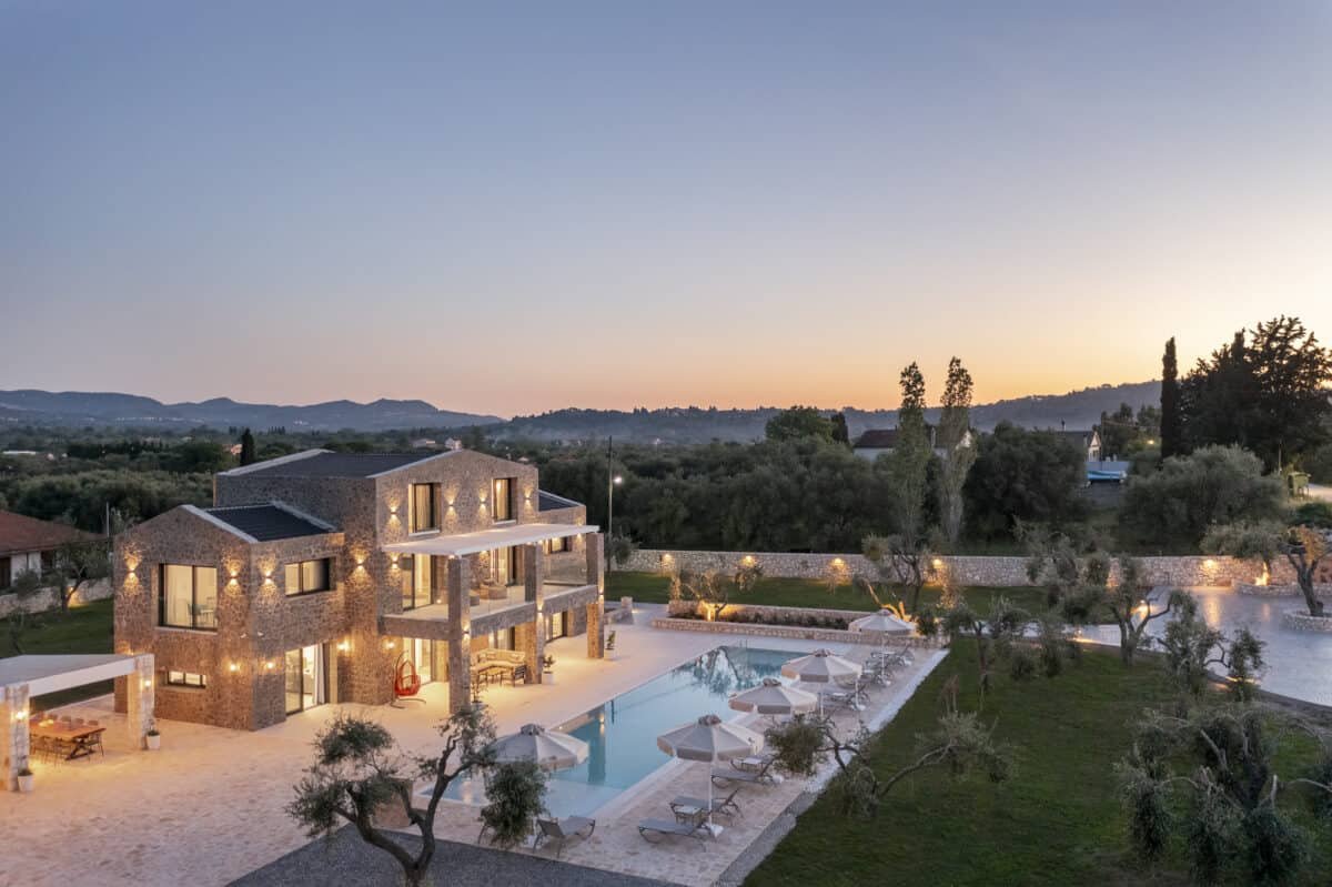 The villa features a contemporary exterior with clean lines and natural materials, meticulously landscaped gardens, and an airy, open-concept interior that blends modern aesthetics with traditional Corfiot elements.